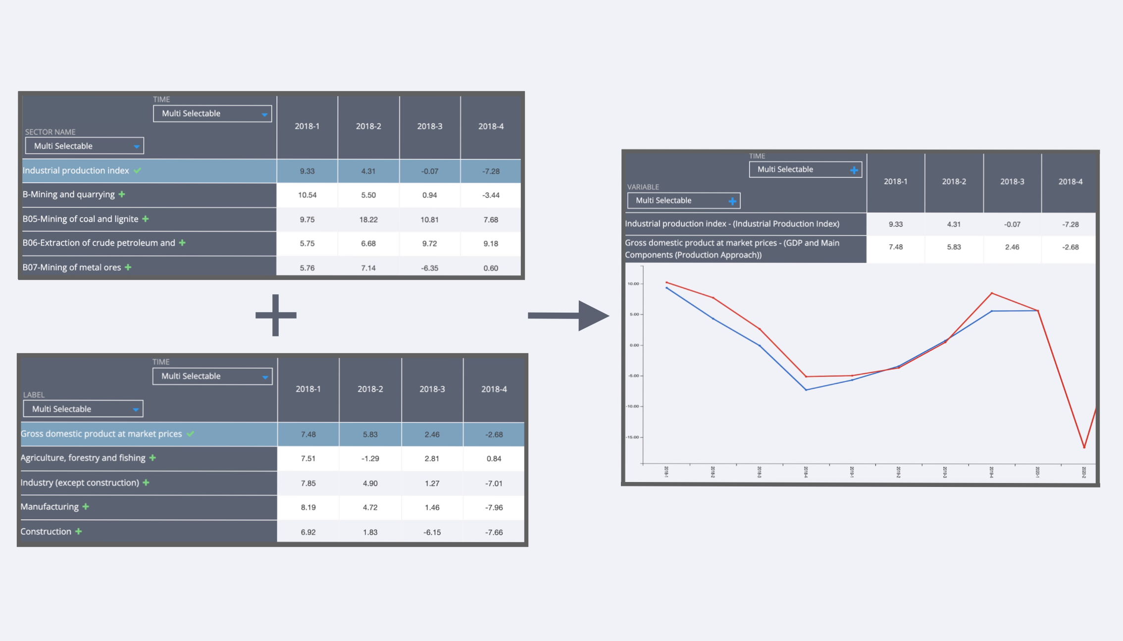 Multi-dimensional datasets are presented in pivot tables; thus, they can be viewed easily in all dimensions by drag&drop and filtering functions